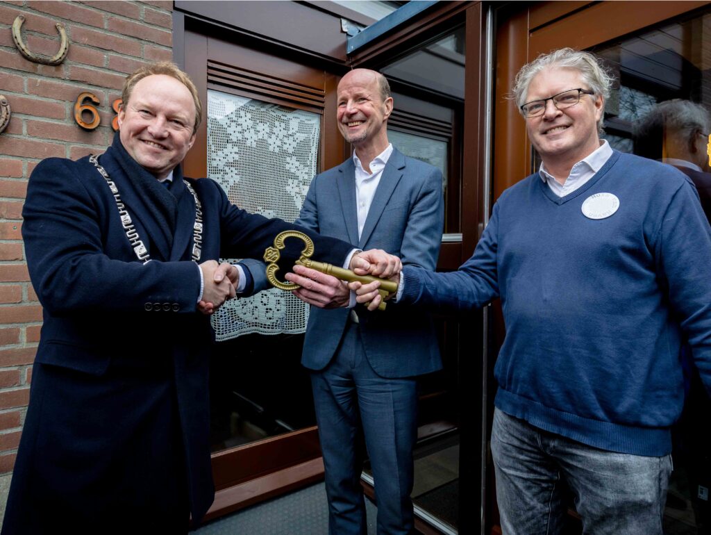 We zijn open! Burgemeester Hein van der Loo opende 29 november 2025 de museumwoning. Hij ontving de sleutel van Schoolwerf 68 uit handen van Koen Westhoff (De Alliantie) en Hein Walter (Acqua Tornata).